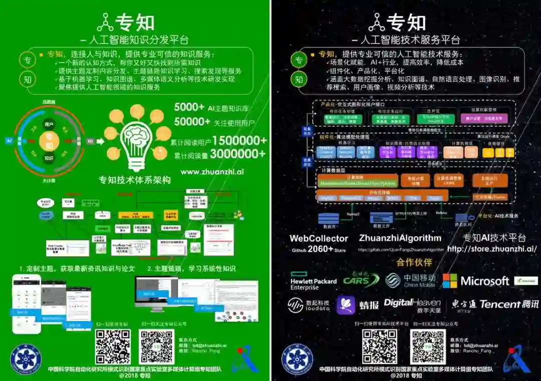 专知来自于中国科学院自动化研究所模式识别国家重点实验室多媒体计算组, 提供专业可信的人工智能知识与技术服务,让认知协作更快更好!专知,第一方面提供专业可信的人工智能知识学习服务,包括专知网站平台www.zhuanzhi.ai和专知公众号,有关注使用用户近5万,累计阅读用户数超过150万人次,累计阅读量300万次; 第二方面提供专业可信的人工智能技术行业服务 store.zhuanzhi.ai,与数十余家企业伙伴进行合作。 专知荣获中国多媒体大会2018年前沿技术杰出展示奖