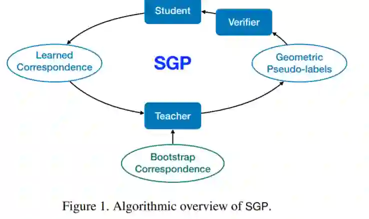 我们提出了自监督几何感知(SGP),这是第一个学习特征描述符进行对应匹配的通用框架,不需要任何真实的几何模型标签(例如,相机姿态,刚性转换)。我们的第一个贡献是将几何感知形式化为一个优化问题,在给定大量视觉测量数据(如图像、点云)的基础上,联合优化特征描述符和几何模型。在这个优化公式下,我们展示了视觉领域的两个重要的研究流,即鲁棒模型拟合和深度特征学习,对应着优化未知变量的一个块,同时固定另一个块。这种分析自然引出了我们的第二个贡献——SGP算法,它执行交替最小化来解决联合优化。SGP迭代地执行两个元算法:一个教师对已知的学习特征进行鲁棒模型拟合以生成几何伪标签,一个学生在伪标签的嘈杂监督下进行深度特征学习。作为第三个贡献,我们将SGP应用于大规模真实数据集上的两个感知问题,即MegaDepth上的相对相机姿态估计和3DMatch上的点云配准。我们证明,SGP达到了最先进的性能,与使用真实标签训练的受监督的模型相当。