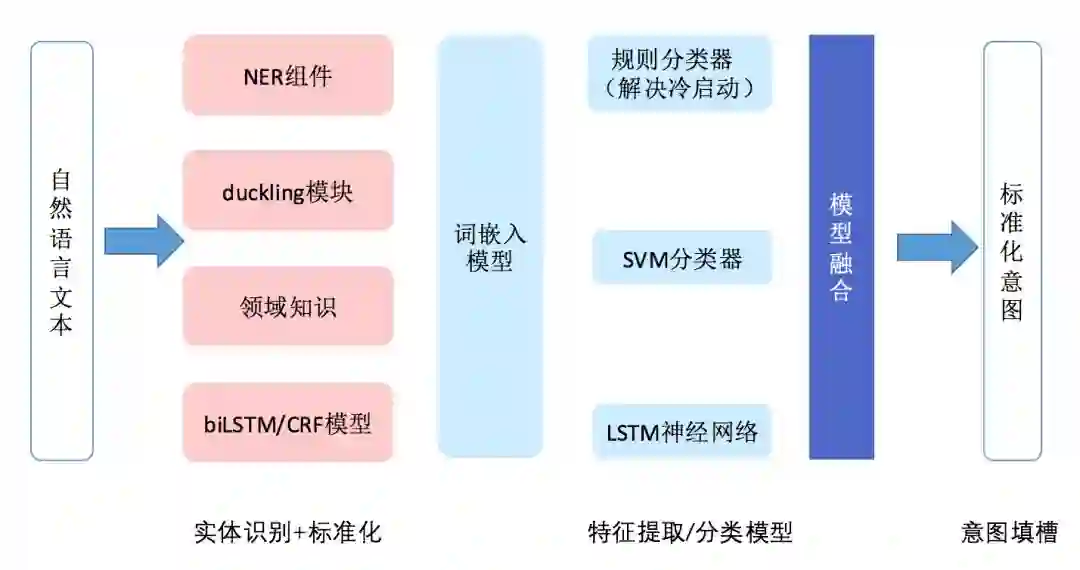 首先,小明接受用户输入的自然语言,通过 NER 组件、duckling 规则模型、领域词典、biLSTM/CRF 等模型识别通用实体及领域实体,并完成实体标准化。