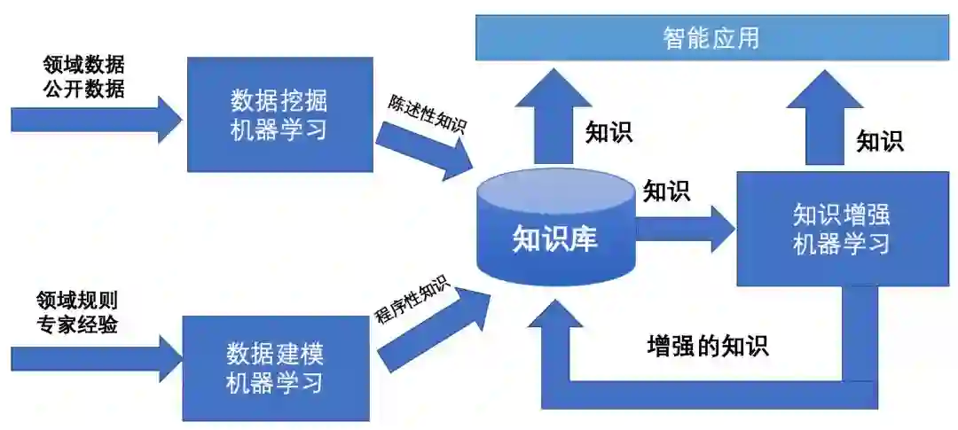 目前智能应用的需求越来越丰富,领域知识图谱为了支撑上层应用也需要更加智能,汇总更多的知识数据。知识图谱与数据挖掘的关系往往是相辅相成的。知识图谱不仅汇总经过治理的知识数据,还应该将产生的知识进一步应用到机器学习算法中,不断产生新的知识反哺知识库,就像大脑在不断学习的过程一样。下图展示了通过知识增强机器学习的过程来不断丰富知识图谱的内容,最终使应用更加智能。