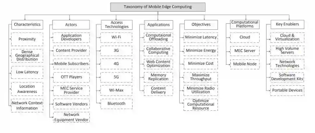 本节描述了移动边缘计算的分类,并对每个组件进行了简短描述。图2显示了移动边缘计算的分类。该移动边缘计算的分类基于以下参数:a)特征,b)演员,c)访问技术d)应用,e)目标,f)计算平台和g)关键促成因素。