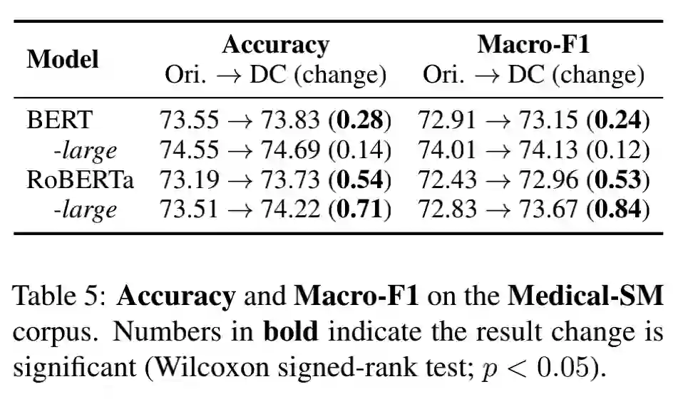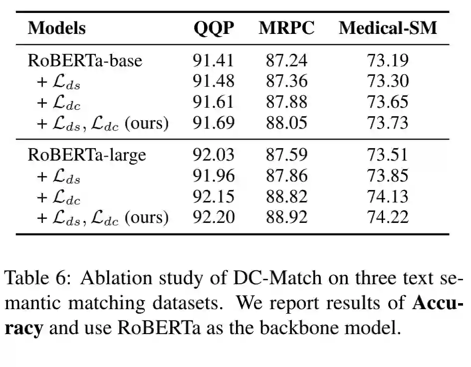 此外,我们在中文文本匹配数据集 Medical-SM 上评估了我们的方法。Medical-SM 是一个三级分类数据集,也即完全匹配、部分匹配、不匹配。除了 acc 之外,我们还使用 MacroF1 来作为评估指标。从表中看到 DC-Match 仍然提高了 PLMs 的匹配效果,表明我们的策略在多分类场景和不同语言中都是非常有效的。