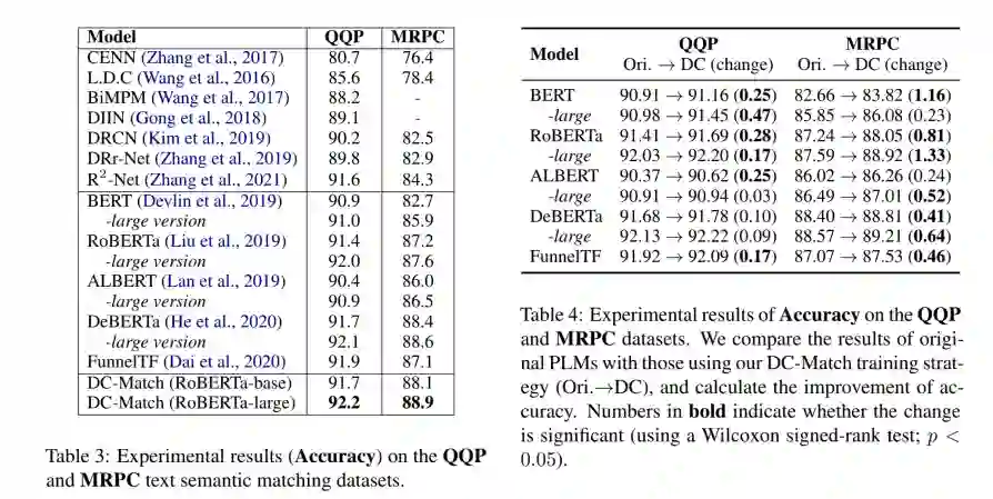 在实验阶段, 我们在三个文本语义匹配基准上评估了我们的方法和所有基线:两个英文数据集 MRPC 和 QQP,以及一个中文数据集 Medical-SM。为了公平比较,我们使用相同的超参数来微调每个 PLM 的原始版本及其 DC-Match 变体。