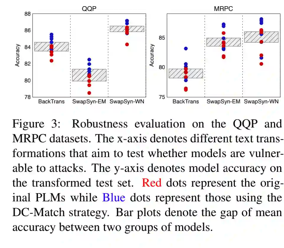 分治策略将关键字从意图中分离出来,为最终的匹配判断提供了额外的可解释性。我们通过进行多中文变化来评估 DC-Match 鲁棒性。我们观察到原始 PLM 和它们的 DC-Match 变体的效果都有所下降。然而,与原始 PLMs 相比,DC-Match 增强后的 PLMs 可以保持更稳定的效果,这表明 DC-Match 可以在一定程度上提高 PLMs 对于文本语义匹配任务的鲁棒性。