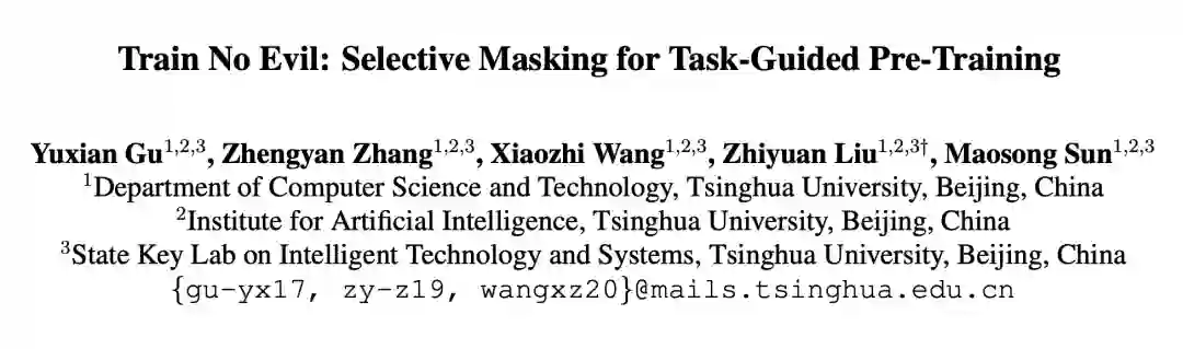 因此本文提出了一种在 pre-train 和 fine-tune 之间加入一个 Selective Masking 的预训练阶段。顾名思义,在这个新的预训练阶段中,模型会去预测那些对于模型来说重要的词。在这个阶段使用的是 in-domain 的数据,可以使预训练模型更好的适应下游任务。在两个句子分析任务上的实验结果表明,本文方法可以在计算量不到 50% 的情况下达到和原模型相当甚至更好的性能,表明本文的方法是有效的。