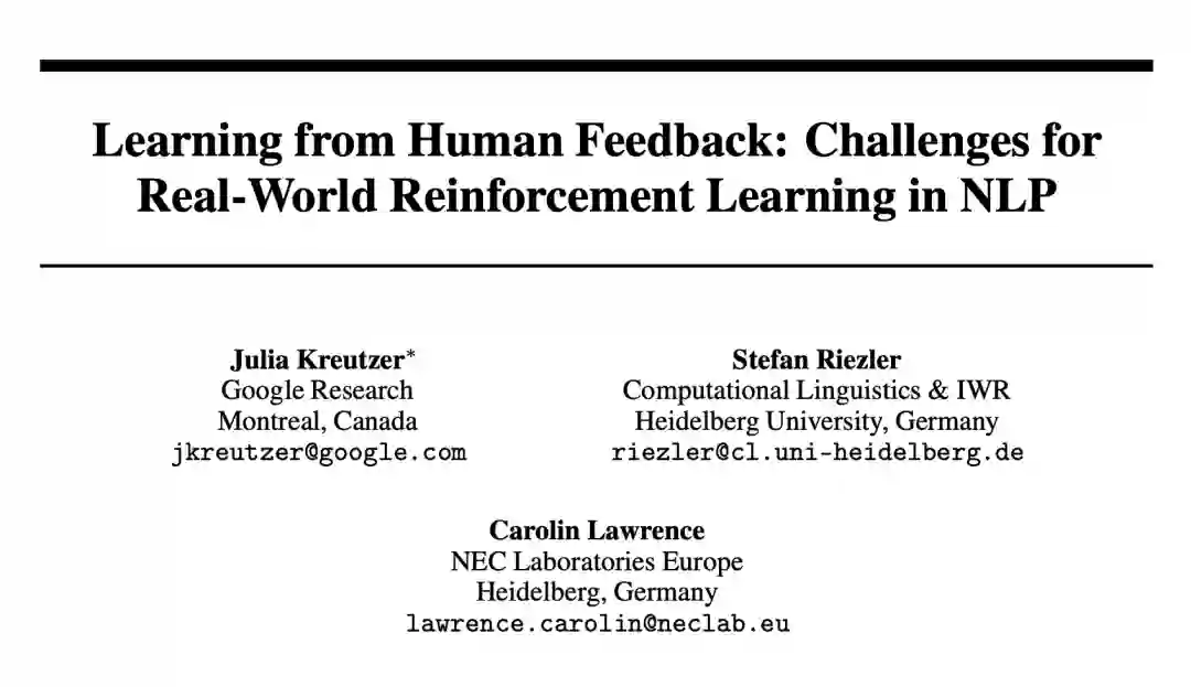 本文是谷歌和海德堡大学发表于 NeurIPS 2020 的工作。这是一篇探索性的文章,主要是针对 NLP 中的强化学习,分析了使用真实世界的 log 信息来辅助强化学习(sequence to sequence learning)存在的问题。作者认为真实世界的 NLP 系统收集了大量的与用户交互的日志信息,例如在自动翻译中,用户可以反馈翻译的质量,同时使用简单的一些操作提升翻译的质量。但考虑到线上系统的一些要求和限制,在线利用这些反馈来更新强化学习系统存在一定的问题,因此本文关注的主要是 NLP 中针对强化学习的反馈离线利用。