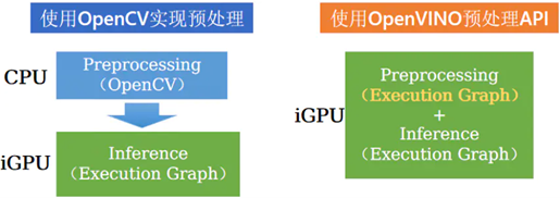 提供预处理API函数。OpenVINO™ 2022.1之前版本不提供OpenVINO runtime原生的用于数据预处理的API函数,开发者必须通过第三方库,比如,OpenCV,来实现数据预处理。OpenVINO™ 2022.1自带的预处理API可以将所有预处理步骤都集成到在执行图中,这样iGPU、CPU、VPU 或今后Intel的独立显卡都能进行数据预处理,大大提高了执行效率;相比之前,用OpenCV实现的预处理,则只能在CPU上执行,如下图所示。