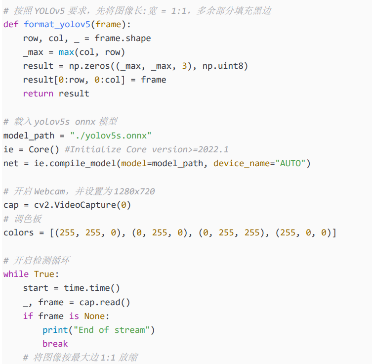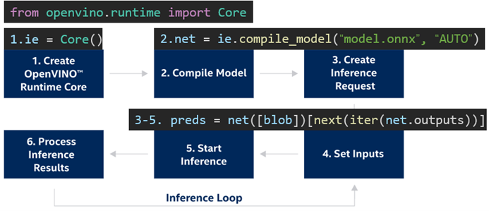 使用OpenVINO™ 2022.1开发推理程序的典型步骤如下所示,从图中可见,三行 OpenVINO API函数可以完成YOLOv5s.onnx模型的推理。