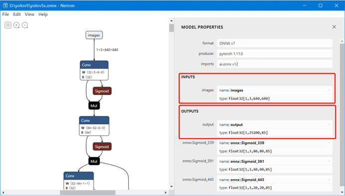 使用Netron(https://netron.app/),查看YOLOv5s.onnx模型的输入和输出。