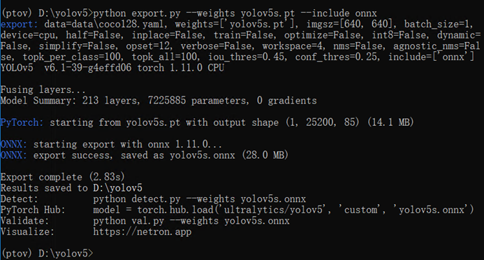 在YOLOv5文件夹下,使用命令:python export.py --weights yolov5s.pt --include onnx,完成YOLOv5s.onnx模型导出,如下图所示。