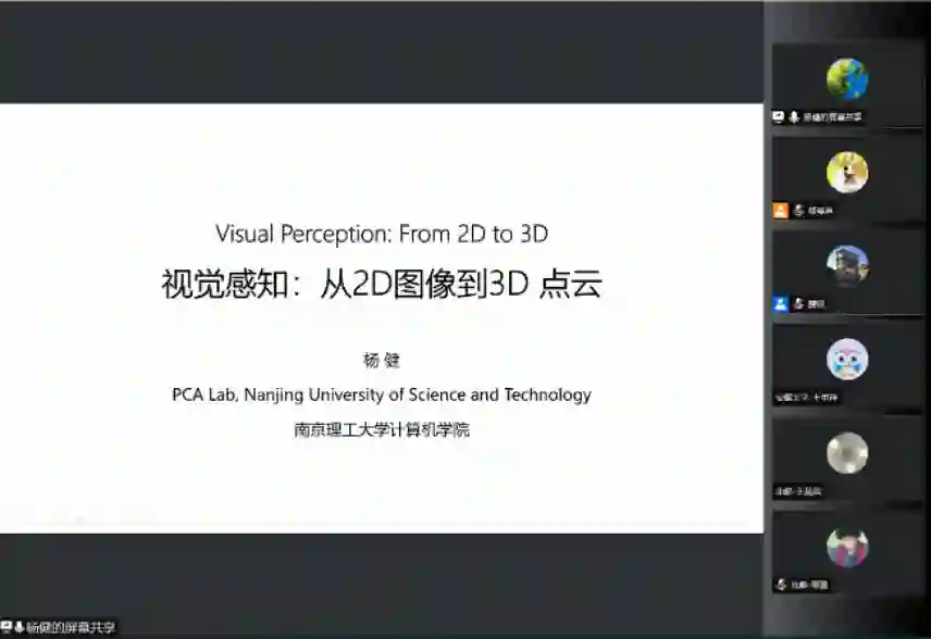杨教授的报告题目是《视觉感知:从2D图像到3D点云》,报告主要包含三个方面的内容:一、基于2D图像的视觉感知方法,如选择核网络、对比学习、目标检测等;二、单目深度估计方法,如多任务、夜晚、开放环境下的深度估计方法;三、基于3D点云的视觉感知方法,如位置识别、目标跟踪、3D重建等。杨键教授对视觉感知的研究背景、发展历程及最新研究进展进行了全面、系统地介绍。