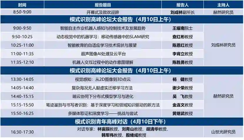 2022年模式识别高峰论坛大会报告和模式识别青年高峰对话全程录像地址为https://space.bilibili.com/379070566/channel/collectiondetail?sid=327058 ,继续感受、学习精彩的大会报告和青年高峰对话(可直接点击“阅读原文”进行观看)。报告及对话时间可参考下表。