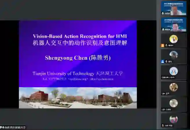 陈教授的报告题为《机器人交互过程中的动作意图理解》。人与机器人总是伴随着各种活动,其动作和行为反映其状况和意图,由于人类活动的复杂性以及不同人对同一动作意图执行的多样性,所以动作行为的分析识别是一项极其重要而又具有挑战性的任务。陈教授的报告针对关于人体动作行为识别的问题开展了讨论,通过计算机视觉进行动作检测、特征提取、符号化动作信息、动作理解、行为分类等方面的过程分析,并以此智能视觉为基础,形成视觉人机交互和手语交互方面智能系统,在机器人与人的交互过程中起到不可或缺的作用。