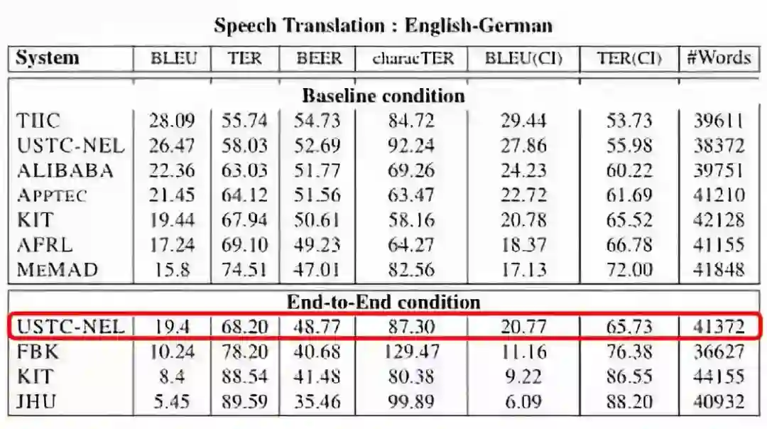 基于语音和机器翻译上雄厚的技术积累,讯飞研究团队针对端到端语音翻译任务开展了探索性研究,最终在英德语音翻译任务的端到端模型评测方案上获得了第一名(与第二名BLEU分数拉开9个百分点,一般而言,提升3个百分点就能明显体会到系统的优劣差异)。