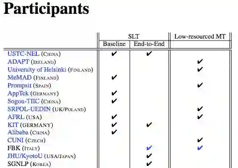 除了科大讯飞,IWSLT 2018吸引了世界各地多所机器翻译领域的知名大学及研究所参加,包括英国爱丁堡大学(University of Edinburgh)、美国约翰霍普金斯大学(JHU)、德国卡尔斯鲁厄理工学院(KIT)、意大利Bruno Kessler 基金会(FBK)、芬兰赫尔辛基大学(Helsinki),以及国内的阿里巴巴、搜狗等。