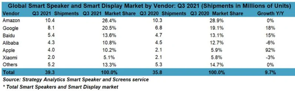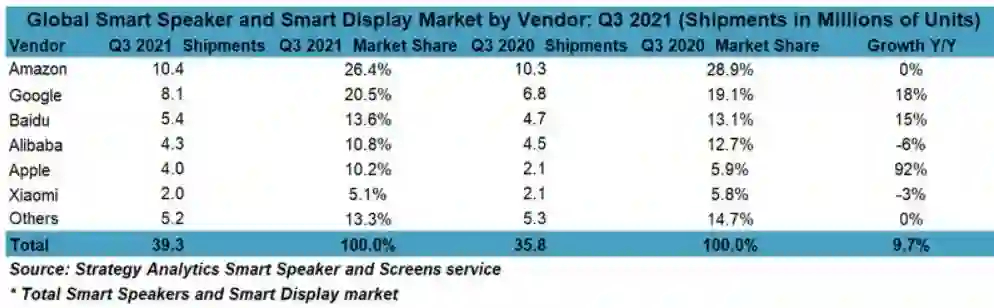 苹果在 2021 年第三季度出货了 400 万台智能音箱,占据了智能音箱和智能屏幕市场 10.2% 的份额。该研究公司表示,谷歌的 Nest Mini 是该细分市场中最畅销的设备,其次是 HomePod mini 和亚马逊的第四代 Echo Dot。具体份额方面,亚马逊、谷歌、百度位列前三,份额达到了 26.4%、20.5%、13.6%。