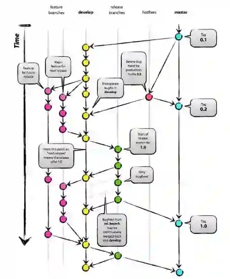 首先有一条master分支,这是发布稳定版,一般不会对 master 进行修改,当有新需求的时候,从 master 上分出一条 develop 分支,具体开发人员在从 develop 上分出自己具体 feature 分支,开发完毕后合并回 develop 分支,测试人员从 develop 分支分出 release 分支进行测试,没有问题了合并到 master 分支发布。如果线上有 bug 需要处理,则从 master 上分出 hotfix 分支,用来解决 bug。