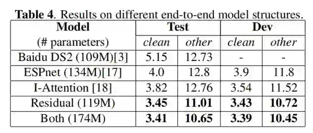 最后,作者使用基于 14600 本书的 Librispeech 公开语言模型扩充数据集训练了两层 LSTM 作为语言模型(LM),在语音识别数据集 Librispeech 上,取得了目前已公开的端到端语音识别网络中的最好效果。目前 Espnet 在 github 的模型,使用该扩充语言模型数据集训练的 LM 后在 test-clean 的表现为 WER=4.0%。相比之下,作者的方法效果提升 16.5%。