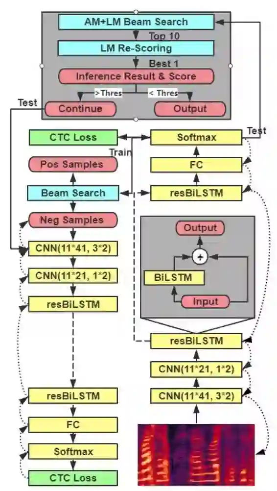 第一是把循环神经网络中的长短时记忆层(LSTM)变成了双向的残差长短时记忆层(resBiLSTM)。此举可以更好地保留之前卷积神经网络所提取出的音素信息和之后每一个双向的残差长短时记忆层更好的结合。因为循环神经网络中的每一层主要是负责提取句子中的语义信息,但语义信息的理解也和音素信息紧密相关。随着循环神经网络的深入,原本更底层的层很难接收到卷积神经网络所给出的信息,对于复杂的长句子中音素和语义信息的结合较差,新提出的残差网络可以较好地修正这一问题。