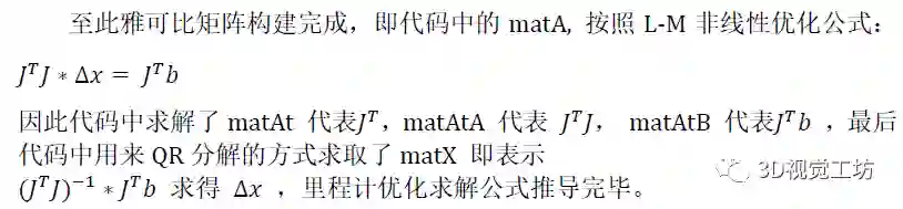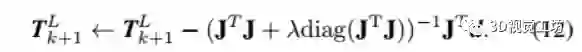 LOAM中利用建立点到线 和点到面的距离最小值来作为约束方程,最后利用L-M非线性优化方法来求解这个非线性问题。对于L-M方法,用到的公式如下: