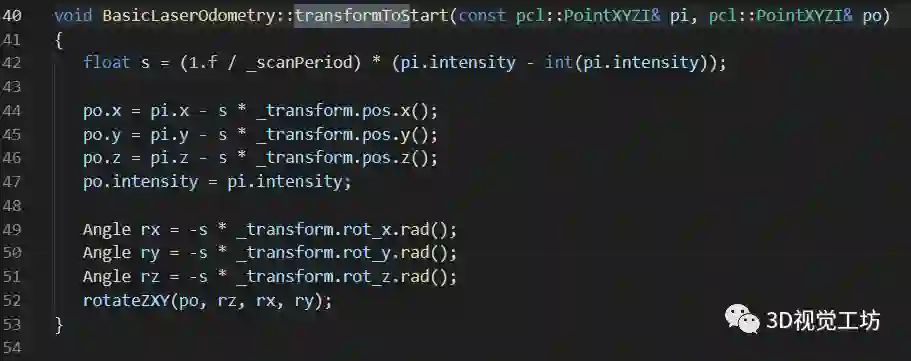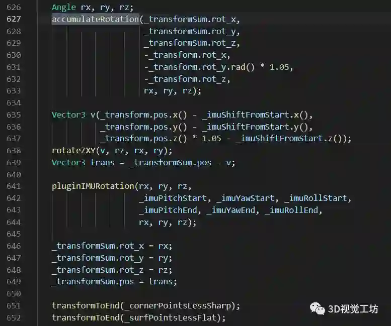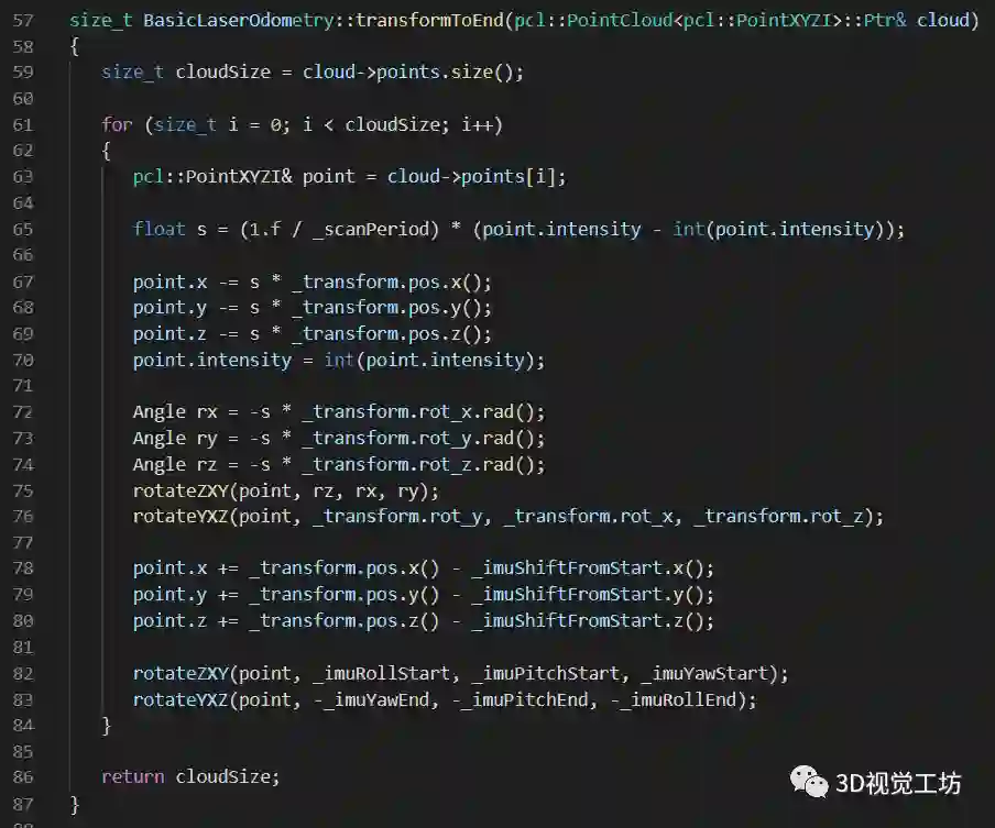 transformToEnd 函数中就是先做了transformToStart ,再将点云全部都转换到一帧的结束时刻。