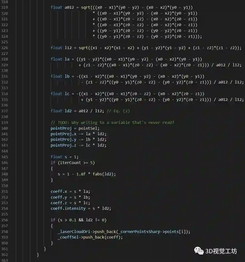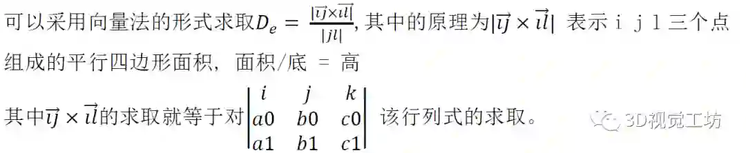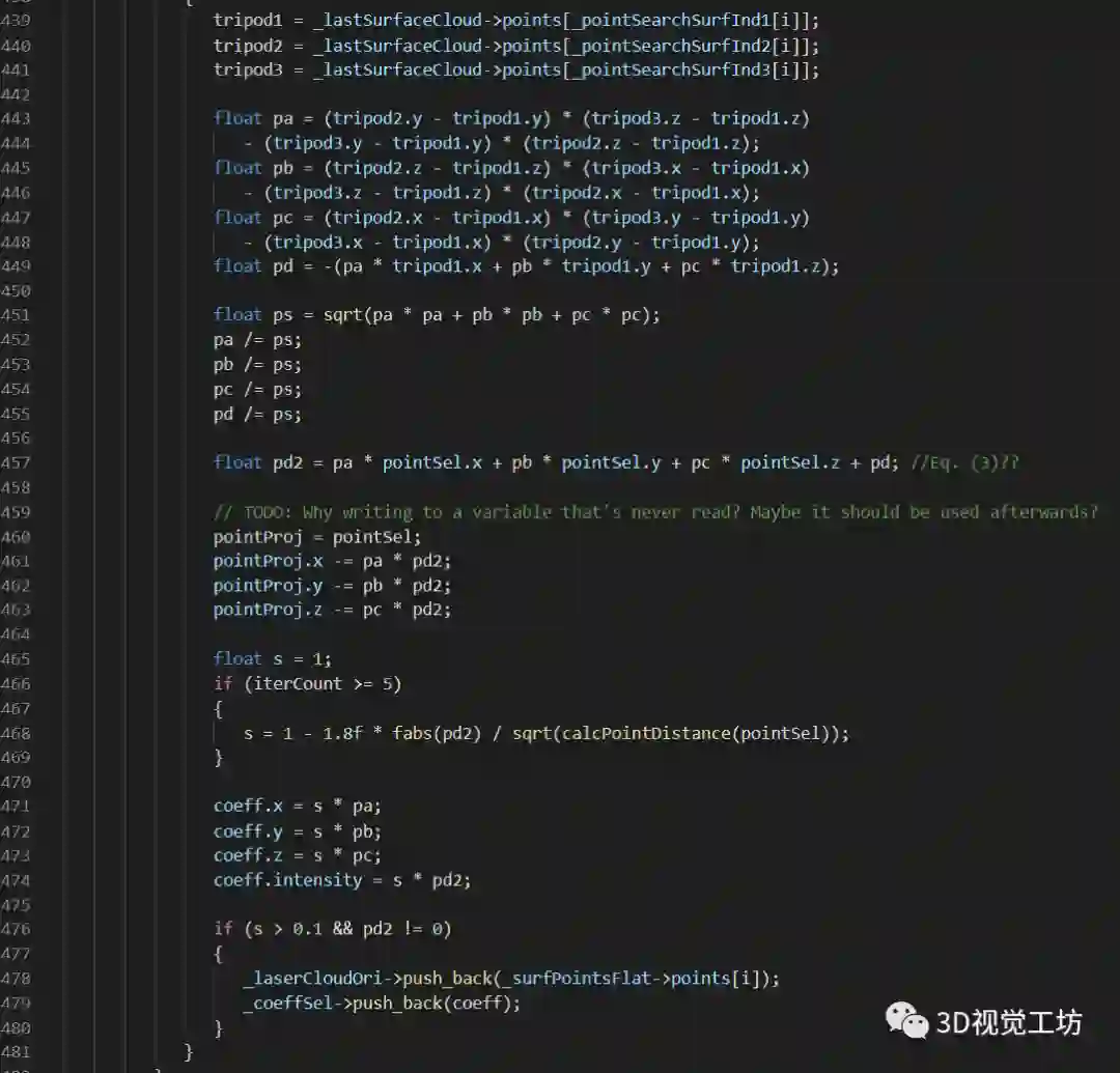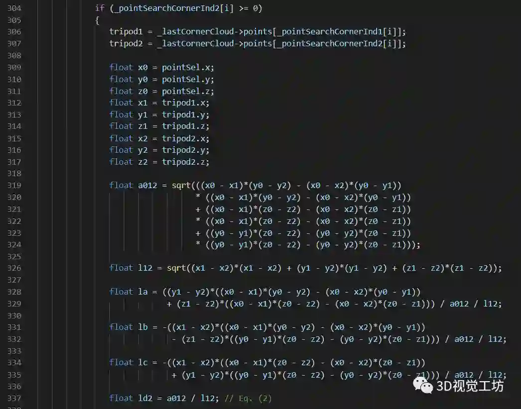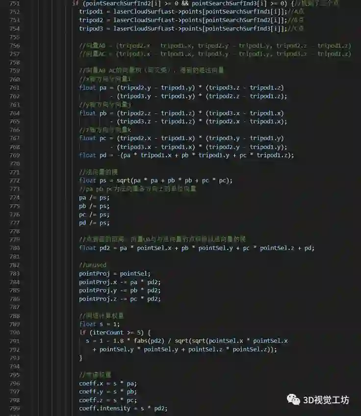 按照算法流程,需要根据提取的特征点,来建立点到线和点到面的约束关系即点到线的距离 和 点到面的距离最小。代码中求取两个距离的原理公式如下: