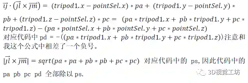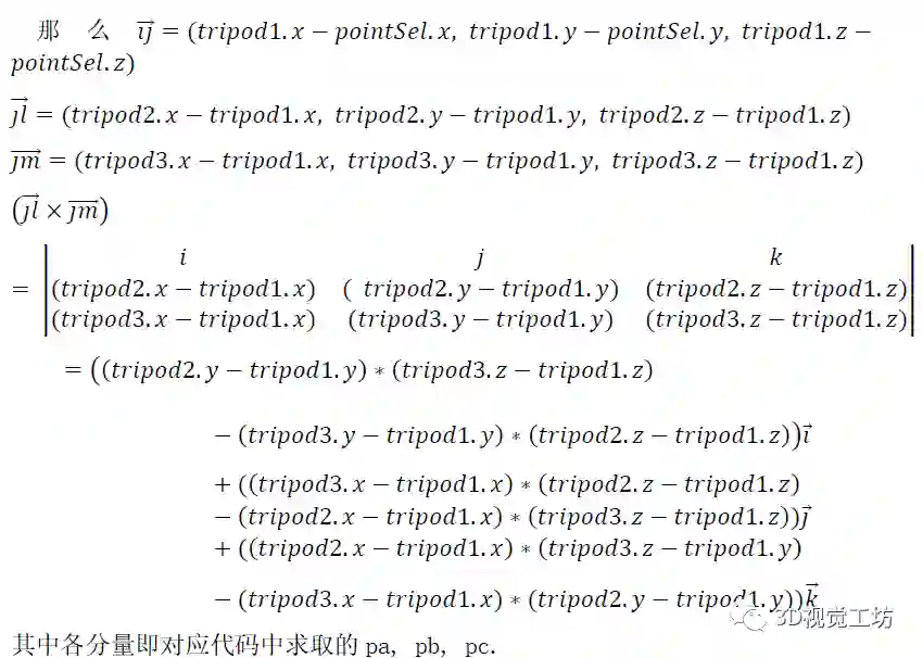 结合代码带入上述公式,i 点坐标为代码中的 (pointSel.x, pointSel.y, pointSel.z);j 点坐标为代码中的(tripod1.x, tripod1.y, tripod1.z);l点坐标为代码中的(tripod2.x, tripod2.y, tripod2.z);m 点坐标为代码中的(tripod3.x, tripod3.y, tripod3.z)。