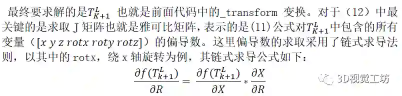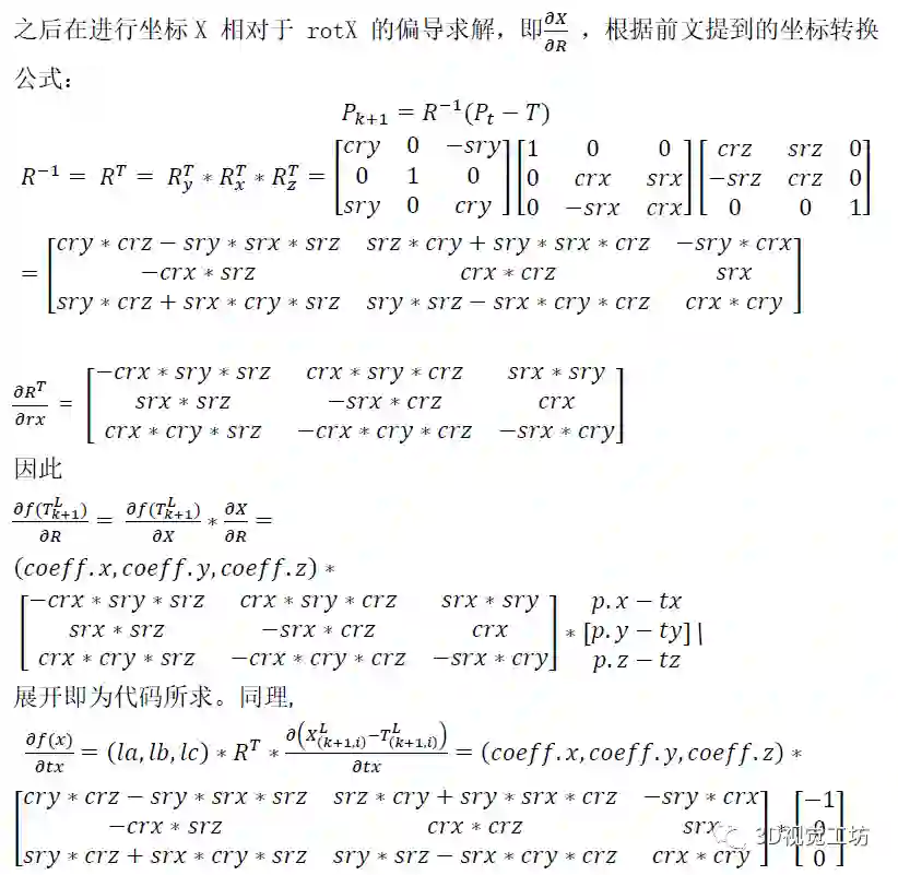 那么根据链式法则,我们就可以先通过约束方程对坐标进行求偏导,然后再乘以坐标对变换中的rotX求偏导,即可得到最终的偏导求取结果。