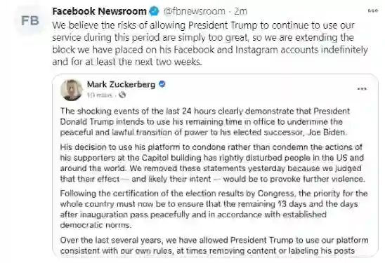 随后,Facebook和Instagram也封了川普的账号,扎克伯格发帖表示「让总统继续使用我们的服务,风险实在太大了」。