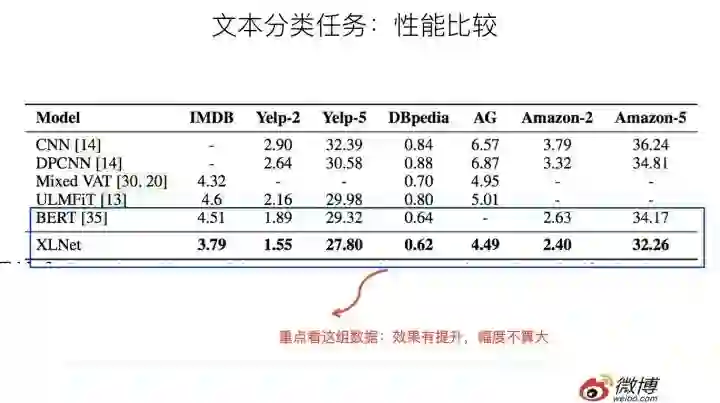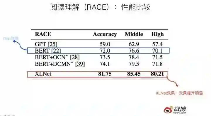 因为和Bert比较,XLNet使用相同的预训练数据。所以两者的性能差异来自于:Permutation Language Model预训练目标以及Transformer XL的长文档因素。