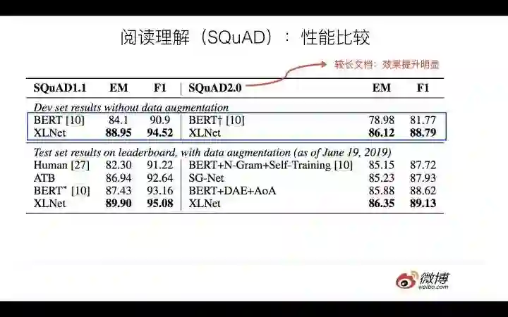 说XLNet在阅读理解,尤其是长文档的阅读理解中,性能大幅超过Bert,这个是没疑问的。但是,因为XLNet融入了上文说的三个因素,所以不确定每个因素在其中起的作用有多大,而对于长文档,Transformer XL的引入肯定起了比较大的作用,Bert天然在这种类型任务中有缺点,其它两类因素的作用不清楚。
