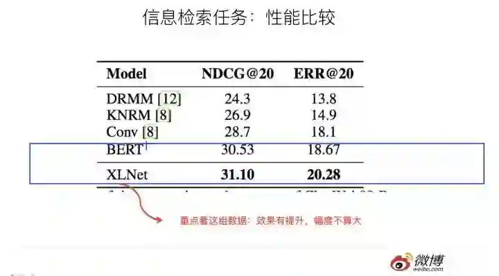 上面是文本分类任务和信息检索任务,可以看出,相对Bert,XLNet效果有提升,但是幅度不算大。仍然是上面的考虑,起作用的三个因素,到底哪个发挥多大作用,从数据方面看不太出来。