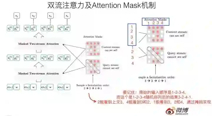 这种在输入侧维持表面的X句子单词顺序,但是其实在Transformer内部,看到的已经是被重新排列组合后的顺序,是通过Attention掩码来实现的。如上图所示,输入看上去仍然是x1,x2,x3,x4,可以通过不同的掩码矩阵,让当前单词Xi只能看到被排列组合后的顺序x3->x2->x4->x1中自己前面的单词。这样就在内部改成了被预测单词同时看到上下文单词,但是输入侧看上去仍然维持原先的单词顺序了。
