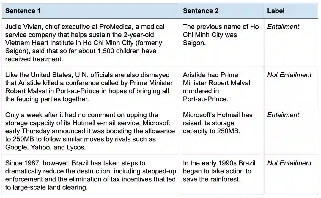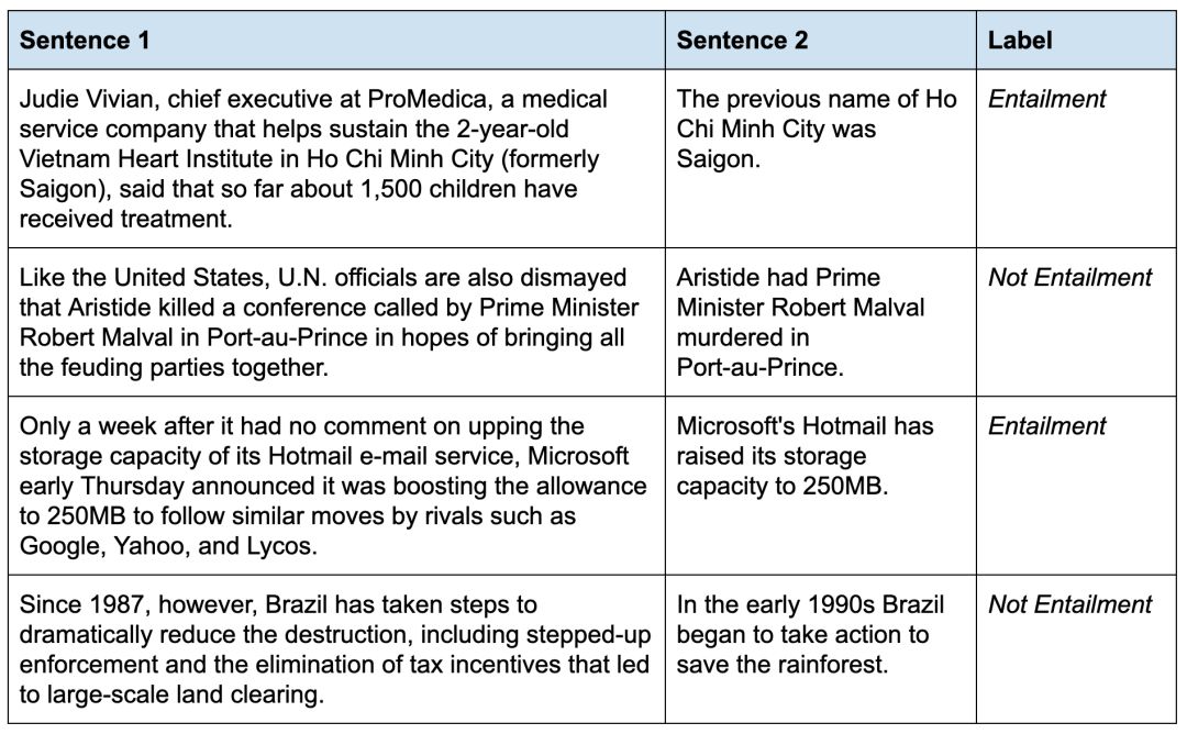 来自 RTE 数据集的示例句子对。标签指示如果句子 1 为真,句子 2 是否必须为真。