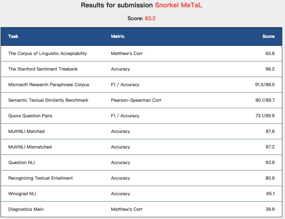 Snorkel MeTaL在GLUE Benchmark上的得分