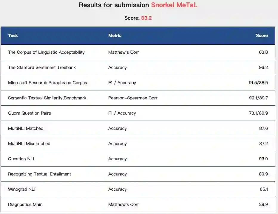 今天,通用语言理解评估基准 GLUE 的排行榜再次被刷新,斯坦福 Hazy Research 的模型 Snorkel MeTaL 的 GLUE 基准得分达到 83.2,排名第一位。