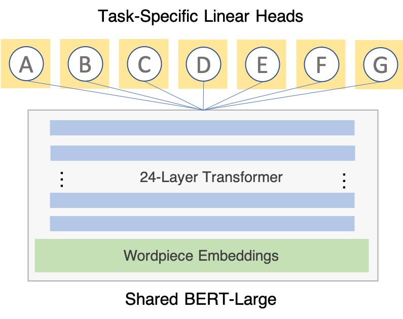 多任务学习架构非常简单:共享部分(包括全部网络参数的 99.99%)是单个 PyTorch 模块(BERT-Large),每个任务都有一个对应特定任务头的任务线性层