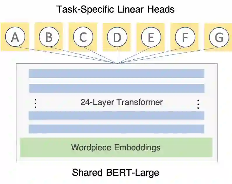 我们使用的多任务学习架构非常简单:共享部分(包括全部网络参数的 99.99%)是单个 PyTorch 模块(BERT-Large),每个任务都有一个对应特定任务头的任务线性层。