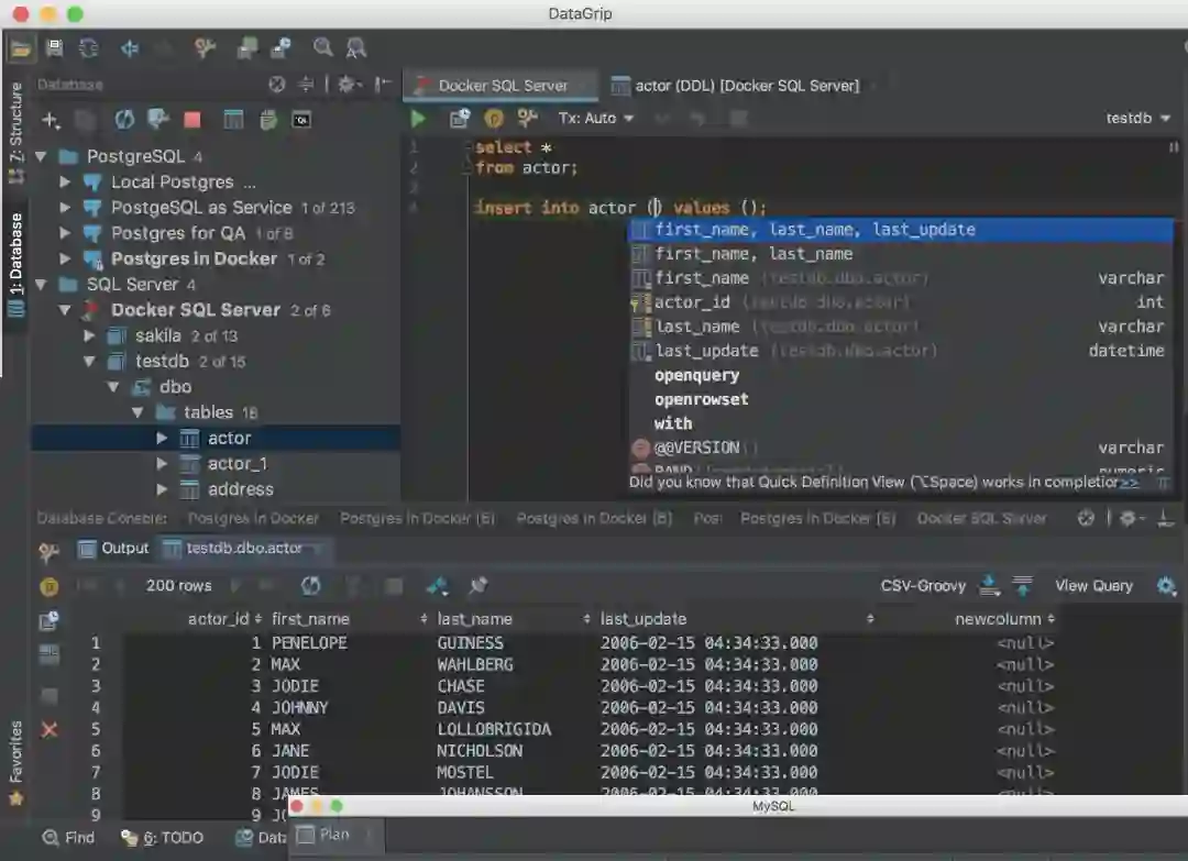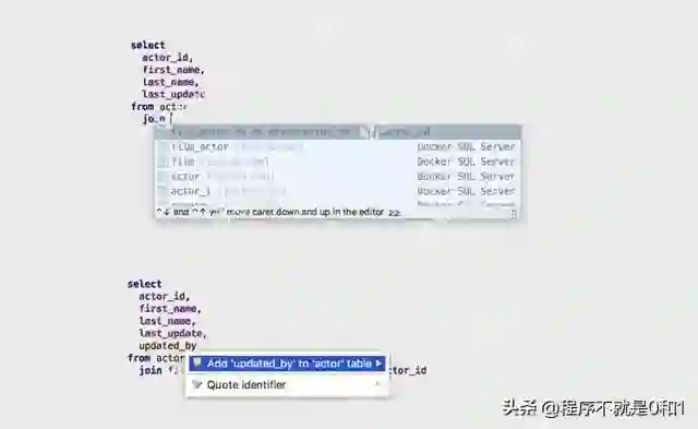 完成DataGrip提供上下文相关的代码完成,帮助您更快地编写SQL代码。完成可以识别表格结构、外键,甚至是您正在编辑的代码中创建的数据库对象。
