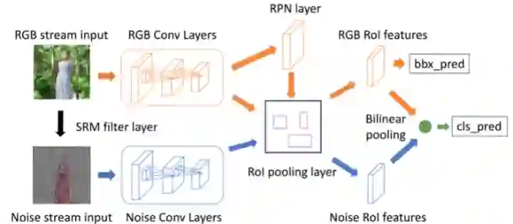 其中,双流之一是RGB流,其目的是从输入的RGB图像中提取特征,以查找篡改伪影,如强对比度、非自然边界等。双流之二为噪声流,是利用富文本分析模型(SRM)滤波层中提取的噪声特征来揭示真实区域和篡改区域之间的噪声不一致性特征,然后通过双线性池化层融合来自两个流的特征,以进一步合并这两种模式的空间特性,提高检测准确性。该算法的贡献为(1)展示了Faster-RCNN网络如何适应图像篡改检测的双流模式;(2)证明了RGB流和噪声流对于检测不同的篡改方式是互补的。为之后做此方向继续深入研究的学者供了创新思路。