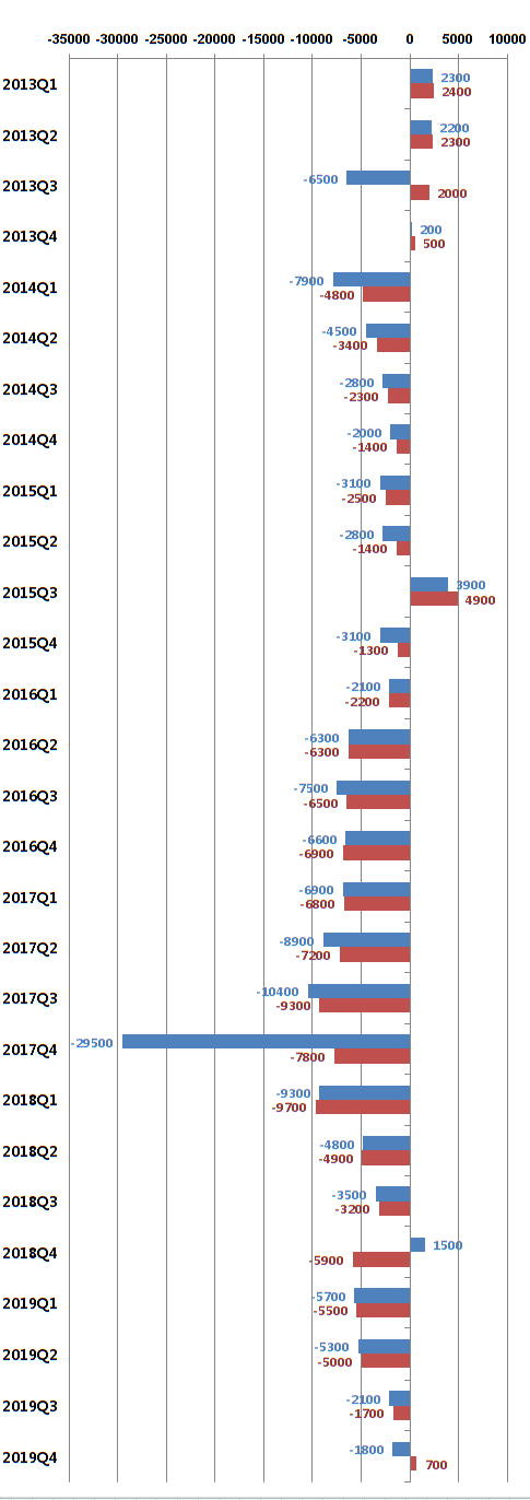 而在本季度之前的三次“扭亏点”也只是昙花一现:2013年Q4,搜狐收获微利后,亏损期持续了6个季度;2015年Q3是搜狐近6年来盈利额最高的一季,但之的10个季度里,搜狐的亏损幅度反而呈扩大趋势;2018年Q4,搜狐实现了美国通用会计准则下盈利,却没能在接下来的3个季度内保持这一趋势。
