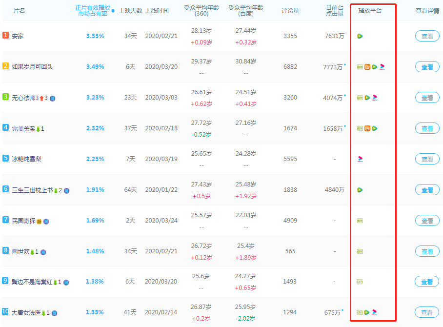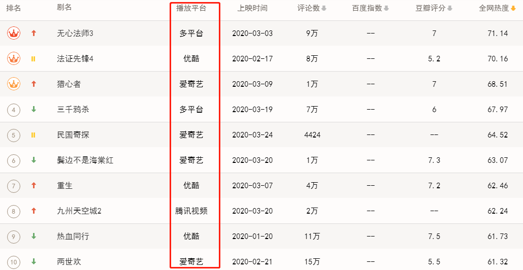 截至2020年3月25日,据骨朵数据和云合数据统计,网剧热度排行榜Top10几乎由优酷、爱奇艺、腾讯视频、芒果TV包揽。