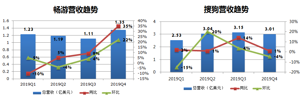 其次,游戏业务也为搜狐贡献了重要营收(搜狐游戏业务主要来自畅游)。其2019年Q4财报显示,该季度游戏业务收入在总收入中的比重扩大5个百分点。