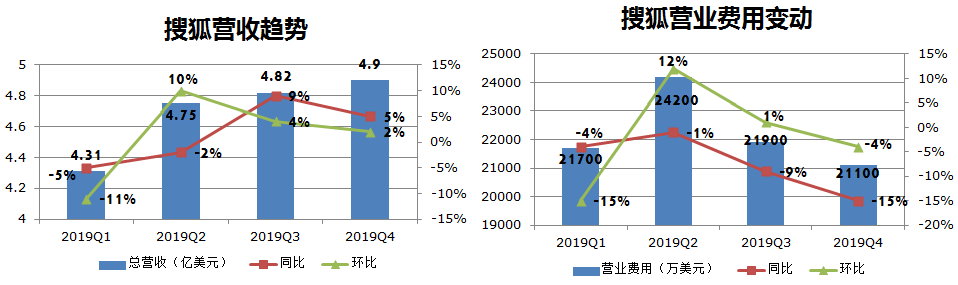 虽然搜狐近5个季度的亏损额不断缩小,但从其营收状况和费用支出情况来看,2019年Q4,搜狐营收增速同比环比双降,同时Q3、Q4两季度营业费用持续降低。这意味着搜狐本季度的盈利或是“节流”成效初显。