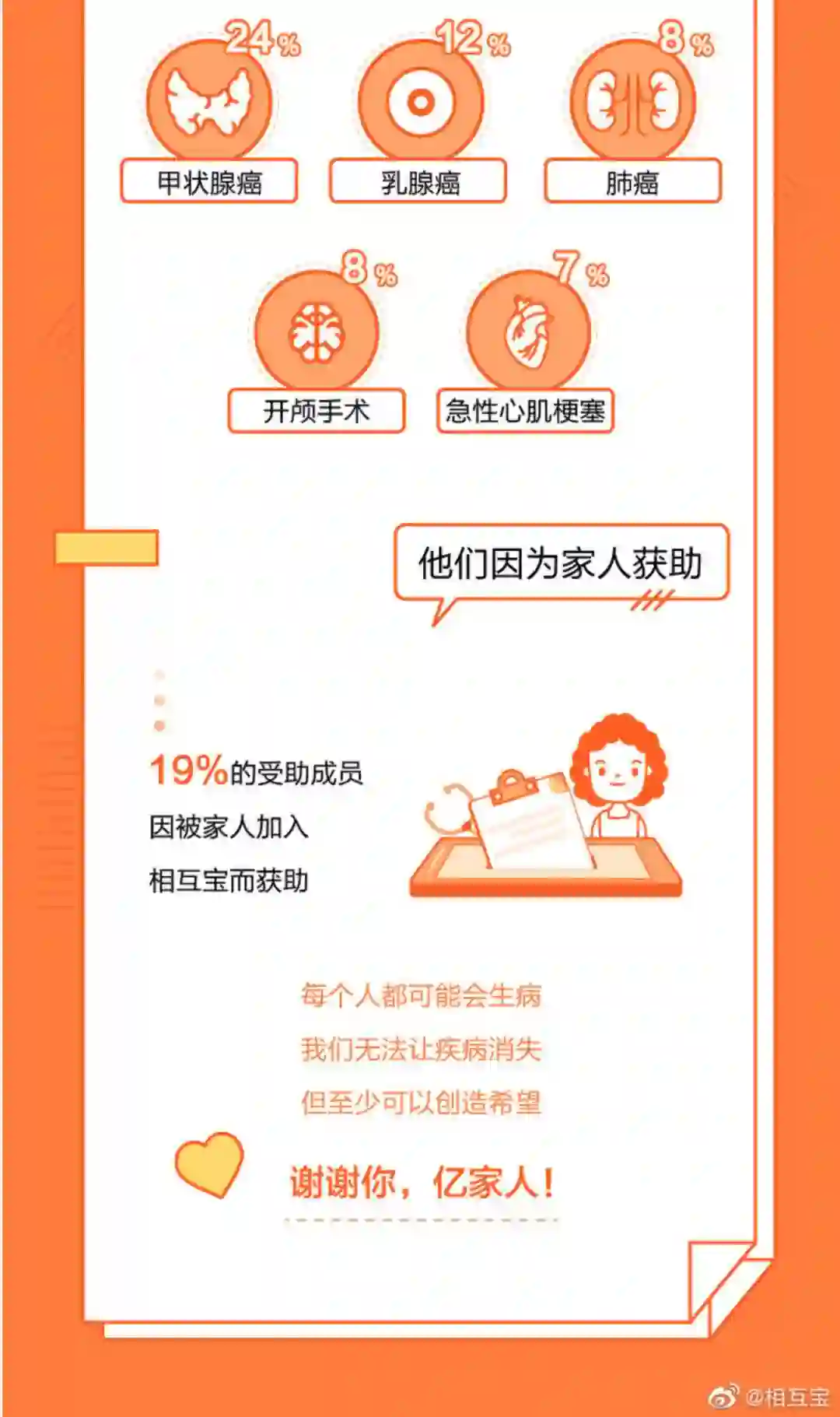 11 月 27 日,支付宝旗下的大病互助计划「相互宝」宣布,截至 11 月 27 日,全国已有超 1 亿人加入相互宝,成为全球最大的互助社区。根据相互宝的公开数据,相互宝的 1 亿成员有三分之一来自农村和县域,近 6 成成员来自三线及以下城市。数据同时显示,这 1 亿人在获得保障的同时,累计救助了 1.19 万名身患重病的成员,其中近一半是 80 后和 90 后。