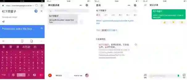 但是撇开同传,我用很经典的一个案例来测试谷歌翻译、腾讯翻译君、有道翻译官以及彩云小译,用了一句唐诗“松下问童子”。各位可以看到错误最明显的是谷歌,它翻译成了“松下电器问了童子”,而从翻译结果来看,腾讯翻译君与彩云小译都完全正确,有道翻译官只说对了一半,所以腾讯的翻译能力还是在业界水平之上的。