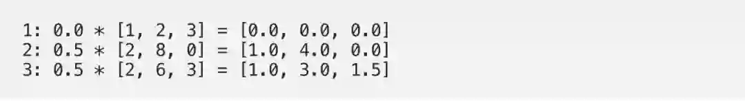 weighted_values = values[:,None] * attn_scores_softmax.T[:,:,None]# tensor([[[0.0000, 0.0000, 0.0000],# [0.0000, 0.0000, 0.0000],# [0.0000, 0.0000, 0.0000]],## [[1.0000, 4.0000, 0.0000],# [2.0000, 8.0000, 0.0000],# [1.8000, 7.2000, 0.0000]],## [[1.0000, 3.0000, 1.5000],# [0.0000, 0.0000, 0.0000],# [0.2000, 0.6000, 0.3000]]])