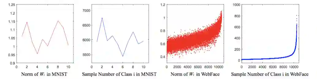 在 [SphereFace] 的附录部分,给出了关于训练数据不均衡如何影响 weight 的 norm 的一个经验分析。左边两张图是 MNIST 上的实验结果,右边两张图是 WebFace 上的实验结果。可见,对于样本数多的类别,它的 weight 的 norm 会更大。