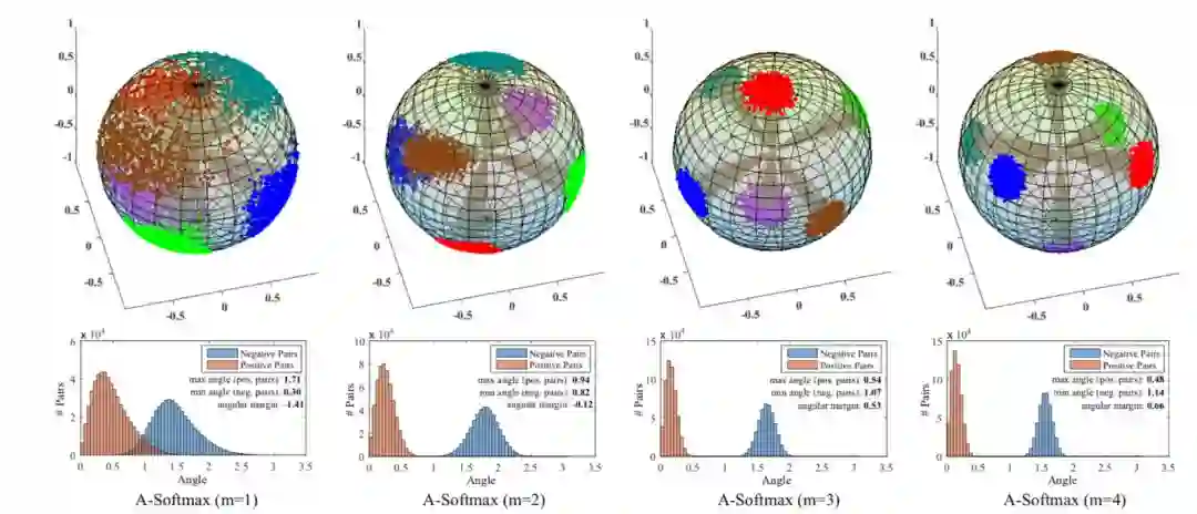 [SphereFace] 作者通过一个很形象的特征分布图,展示了引入 margin 的效果,可见,随着 margin 的增加,类内被压缩的更紧凑,类间的界限也变得更加清晰了。