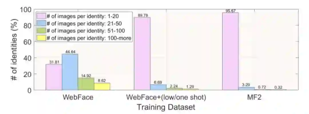 为了搞清楚为什么需要做 weight normalization,这首先要从数据不均衡的问题说起,这一问题在常见的人脸识别数据集中很普遍。下图展示了在几个常用的人脸识别数据集上类别与 sample 数量的统计分布。